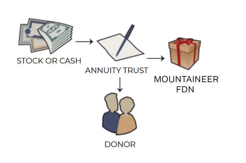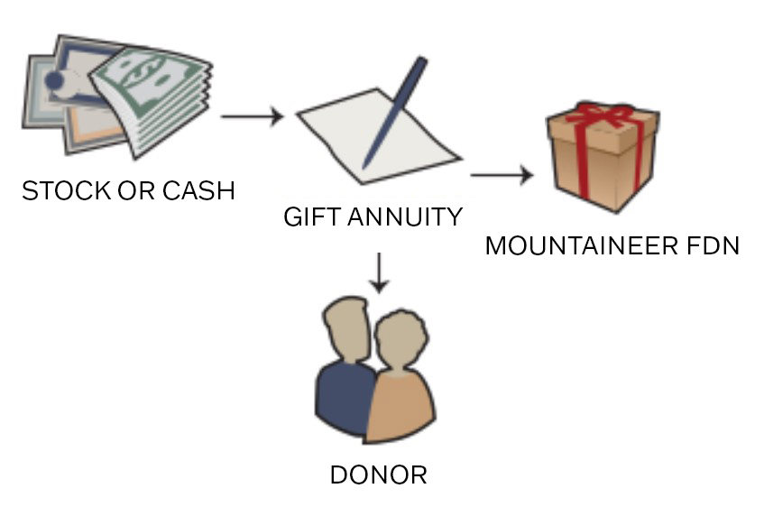 Current charitable gift annuity (payments begin within one year). With a current gift annuity, you may transfer cash or property in exchange for our promise to pay you fixed payments beginning as early as this year. You will receive an income tax charitable deduction this year for the value of your gift to The Mansfield Mountaineer Foundation.